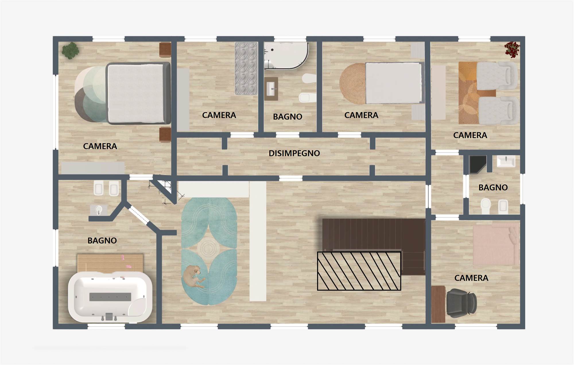 Salendo la scala principale si accede al Piano primo con cinque camere da letto , tra cui una suite padronale con doppia finestra panoramica, stanza guardaroba e tre bagni dotati di ogni comfort.